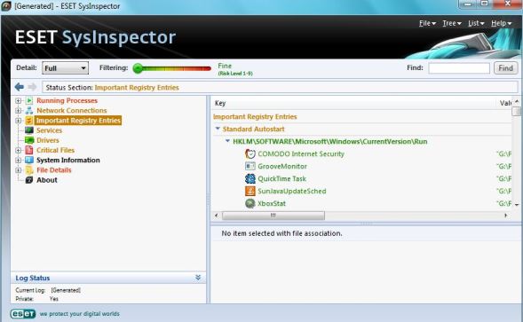 ESET SysInspector is a free, state of the art diagnostic tool for Windows systems. It is also an integral part of ESET Smart Security 4 and ESET NOD32 Antivirus 4. It peers into your operating system and captures details such as running processes, registry content, startup items and network connections. Once a snapshot of the system is made, ESET SysInspector applies heuristics to assign a risk level for each object logged. Its intuitive graphical user interface enables the user to easily slice through the large volume of data using a slider to select objects of a particular color coded risk level for closer examination. ESET SysInspector is a convenient utility for the tool box of every IT expert and first responder.Key Features: